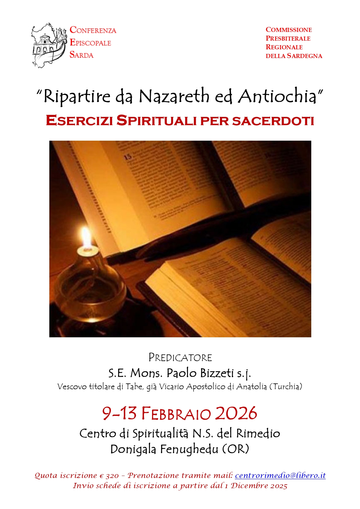 La Conferenza episcopale sarda, attraverso la Commissione presbiterale regionale, propone anche per il 2026 gli esercizi spirituali riservati ai sacerdoti dell’Isola. L’appuntamento si svolgerà dal 9 al 13 febbraio 2026 presso il Centro di spiritualità Nostra Signora del Rimedio, a Donigala Fenugheddu (OR).