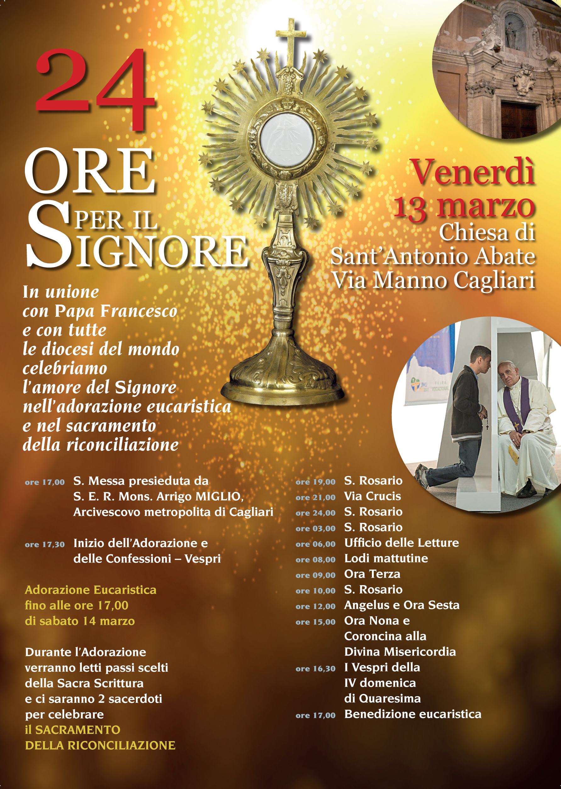24 ORE PER ILSIGNORE 2015 ICOAnche la diocesi di Cagliari, tra il 13 e il 14 marzo, in unione con Papa Francesco, aderisce all’iniziativa «24 ore per il Signore». La sede cittadina dell’evento è la chiesa di Sant’Antonio Abate in via Manno a Cagliari.