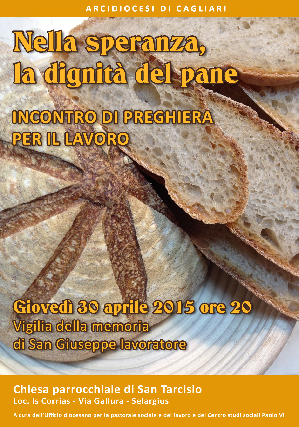 Giovedì 30 aprile 2015, vigilia della memoria di San Giuseppe lavoratore, alle ore 20.00, presso la chiesa parrocchiale di San Tarcisio (Loc. Is Corrias – Via Gallura – Selargius), si terrà un incontro di preghiera per il lavoro promosso dall’Ufficio diocesano per la pastorale sociale e del lavoro e dal Centro studi sociali Paolo VI. Il tema proposto dalla Commissione episcopale della Cei per il 1° maggio 2015 è «Nella speranza, la dignità del pane».