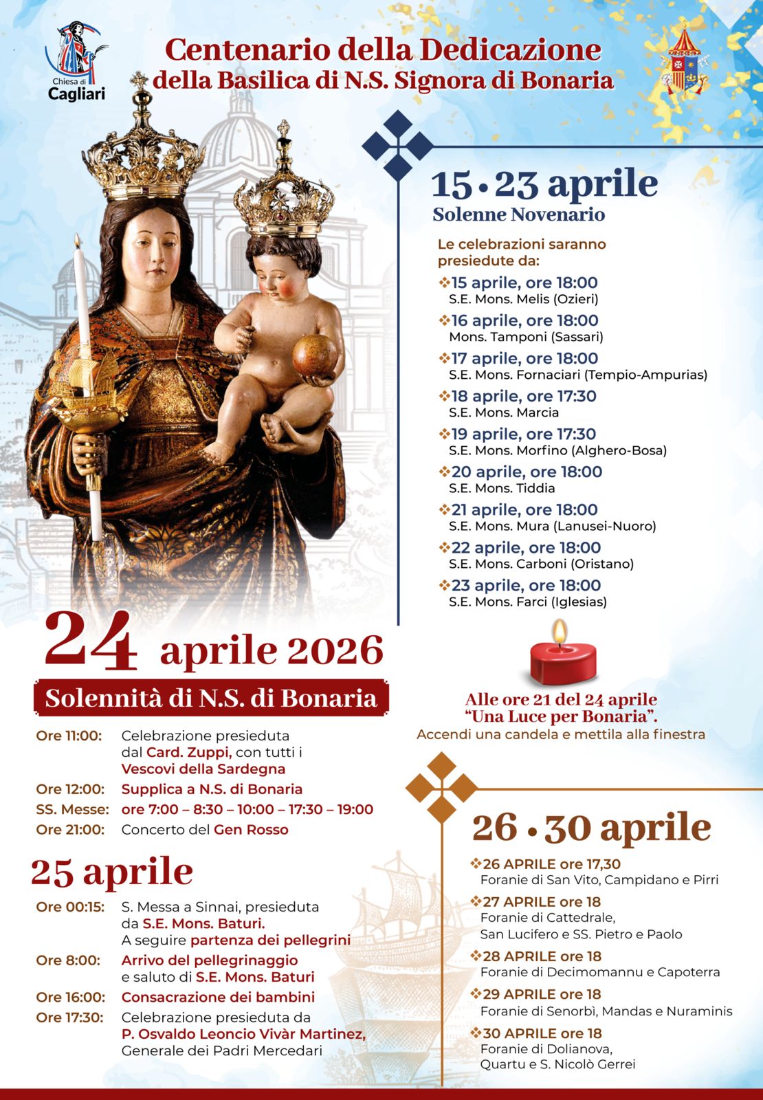 Il cammino culminerà nella solennità del 24 aprile, quando alle ore 11 è prevista la celebrazione eucaristica presieduta dal Cardinale Matteo Zuppi, con la partecipazione di tutti i vescovi della Sardegna. Seguirà, alle ore 12, la supplica a Nostra Signora di Bonaria. Durante la giornata saranno celebrate anche altre Messe, mentre in serata, alle ore 21, si terrà il concerto del Gen Rosso.