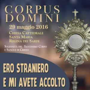 Domenica 29 maggio 2016, solennità del Santissimo Corpo e Sangue del Signore, si terrà la processione eucaristica per le strade della città di Cagliari, presieduta dal vescovo Arrigo Miglio. Quest’anno è sato scelto il tema «Ero straniero e mi avete accolto» (Mt 25,35). Presso la Cattedrale, alle ore 18.30, saranno celebrati i secondi vespri, seguirà […]