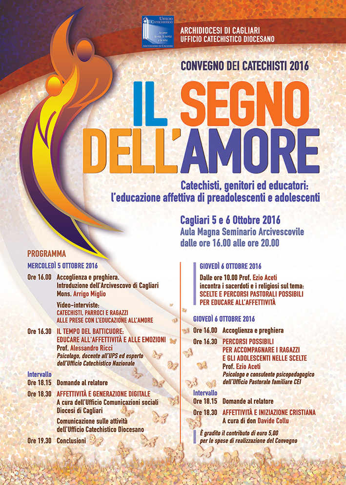 «Il segno dell’Amore», questo il titolo del convegno, oltre a dare voce ai catechisti, ai sacerdoti e agli educatori sulle esperienze, difficoltà e iniziative per aiutare i ragazzi a cogliere la novità del Vangelo anche in riferimento alla maturazione affettive e alla scelta di amare, potrà contare sul prezioso contributo di esperti a riguardo:  Prof. Alessandro Ricci, psicologo, docente all’UPS ed esperto dell’Ufficio Catechistico Nazionale, che aiuterà a cogliere l’importanza dell’educazione alle emozioni, e il Prof. Ezio Aceti, psicologo e consulente psicopedagogico Ufficio Pastorale familiare CEI, che traccerà percorsi possibili da condividere nella comunità cristiana per accompagnare i ragazzi e i giovani nelle scelte e nella scelta di amare così come il Signore chiede.