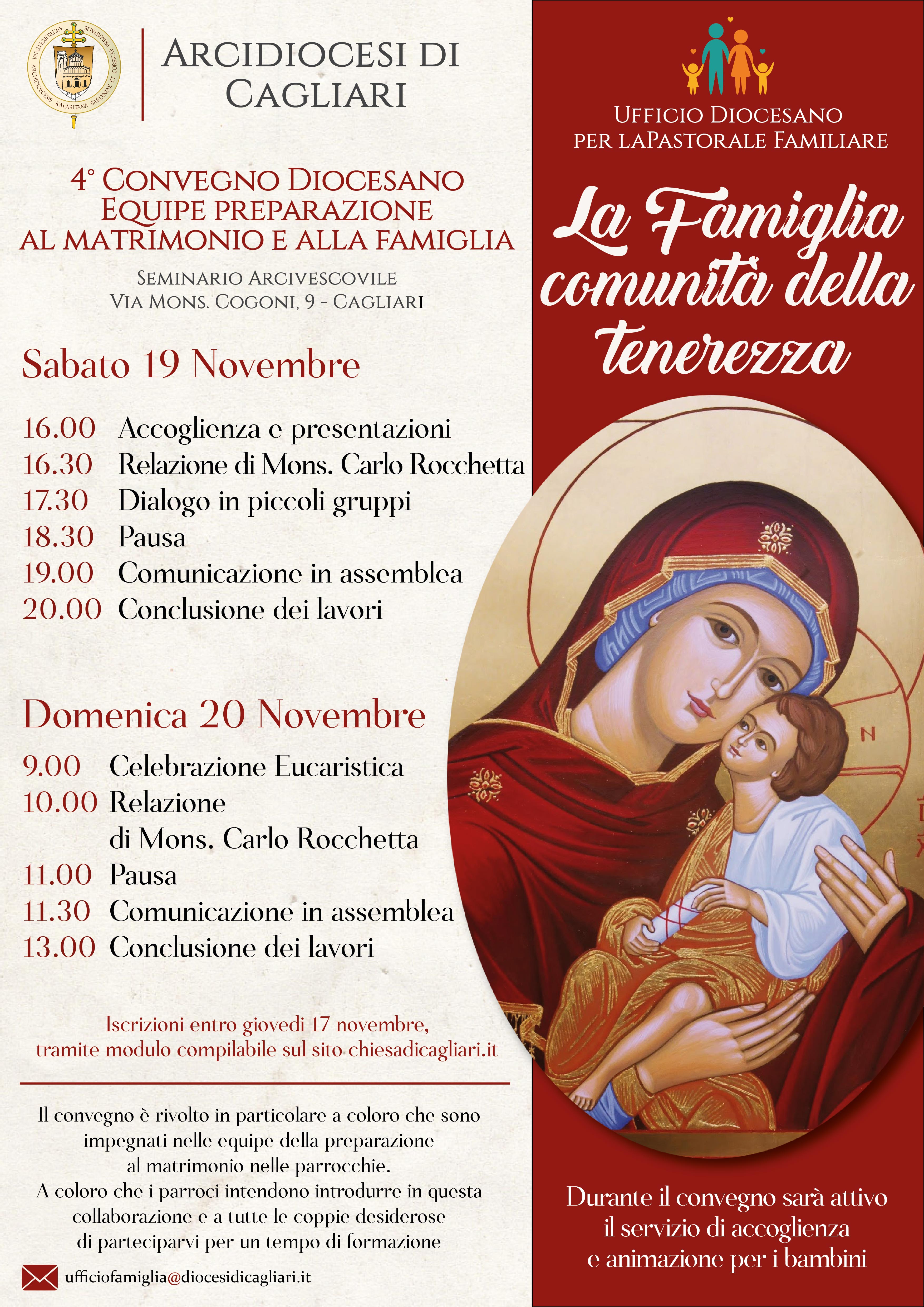 StampaSabato 19 e domenica 20 novembre si terrà il «4° Convegno diocesano delle équipe di preparazione dei fidanzati al matrimonio». L’incontro, che si svilupperà a partire dalle 16 di sabato presso l’aula magna del Seminario diocesano in via Monsignor Cogoni a Cagliari, e proseguirà domenica dalle 9 con la Messa per concludersi alle 13.