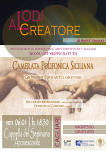 A tre anni dall’inizio del suo episcopato a Cagliari, la Camerata polifonica siciliana omaggia il vescovo e segretario generale della Cei monsignor Giuseppe Baturi, venerdì 6 gennaio alle ore 18.30 nella Cappella del Seminario arcivescovile (via monsignor Giuseppe Cogoni 9, Cagliari), con lo spettacolo «Lodi al Creatore». Le musiche sono tratte dal corpus liturgico denominato «Liturgia Corale del Popolo di Dio», composto da André Gouzes. Dirige Giovanni Ferrauto, voce recitante Riccardo Montanaro e regia di Donatella Capraro.