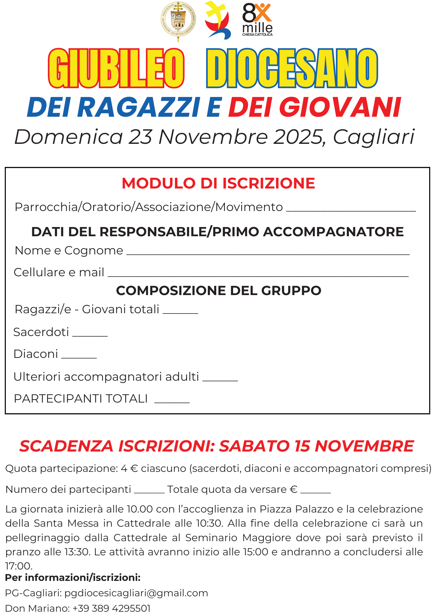 Domenica 23 novembre 2025 a partire dalle 10, presso la Cattedrale di Cagliari (piazza Palazzo 4/a), nella Solennità di Cristo Re e Giornata Mondiale della Gioventù nelle Chiese particolari, si celebrerà il Giubileo diocesano dei ragazzi e dei giovani, un momento di festa e di fede per tutti i ragazzi dai 14 anni in su, che vivranno insieme al vescovo un’esperienza di preghiera, cammino e incontro. Dopo il raduno in piazza Palazzo, alle 10.30 è prevista la santa messa , a seguire il pellegrinaggio verso il Seminario regionale, dove le attività si concluderanno nel pomeriggio.