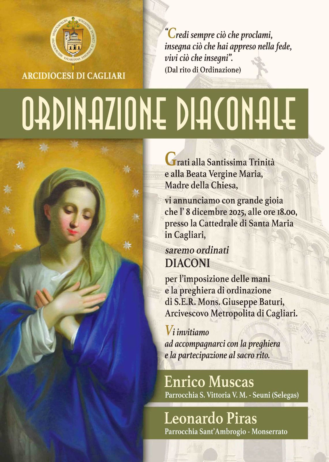 Lunedì 8 dicembre 2025, alle ore 18, nella Cattedrale di Santa Maria a Cagliari (piazza Palazzo 4/a), l’arcivescovo monsignor Giuseppe Baturi presiederà la celebrazione per l’ordinazione diaconale di Enrico Muscas (parrocchia Santa Vittoria Vergine e Martire – Seuni, Selegas) e Leonardo Piras (parrocchia Sant’Ambrogio – Monserrato).