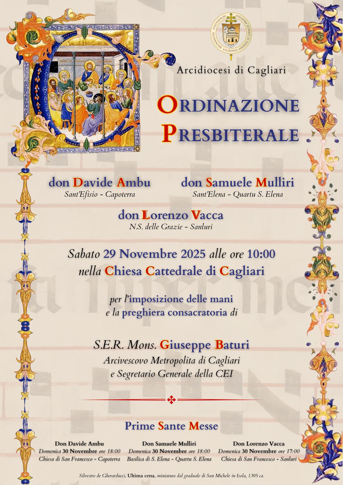 Sabato 29 novembre alle 10.00, presso la Cattedrale di Cagliari (Piazza Palazzo 4/a), si terrà la celebrazione di ordinazione presbiterale di tre nuovi sacerdoti della diocesi di Cagliari. A presiedere il rito sarà l’Arcivescovo monsignor Giuseppe Baturi. L’evento rappresenta un momento di grande importanza per la comunità locale, che si prepara ad accogliere con gioia il dono del sacerdozio di don Davide Ambu, don Samuele Mulliri e don Lorenzo Vacca.