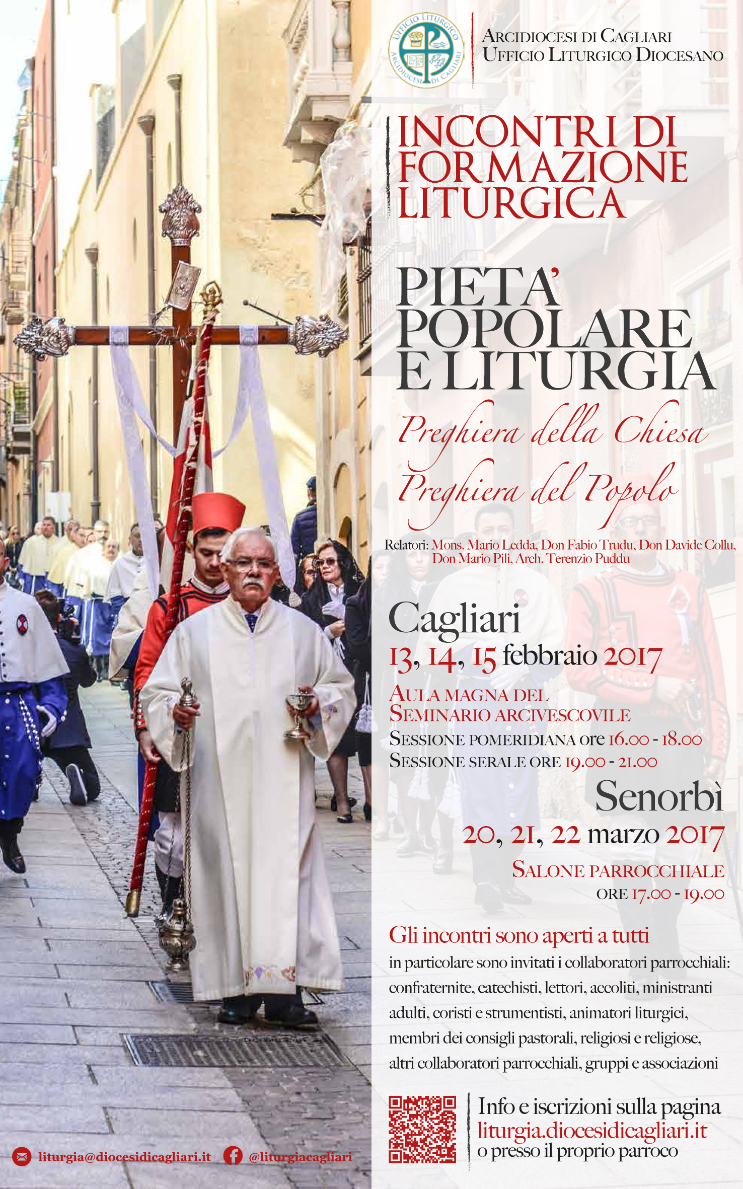 L’Ufficio liturgico diocesano propone una «tre sere» di formazione a partire dai temi fondamentali della pietà popolare in rapporto alla liturgica. Le lezioni si terranno a Cagliari nel mese di febbraio e saranno replicate a Senorbì nel mese di marzo.