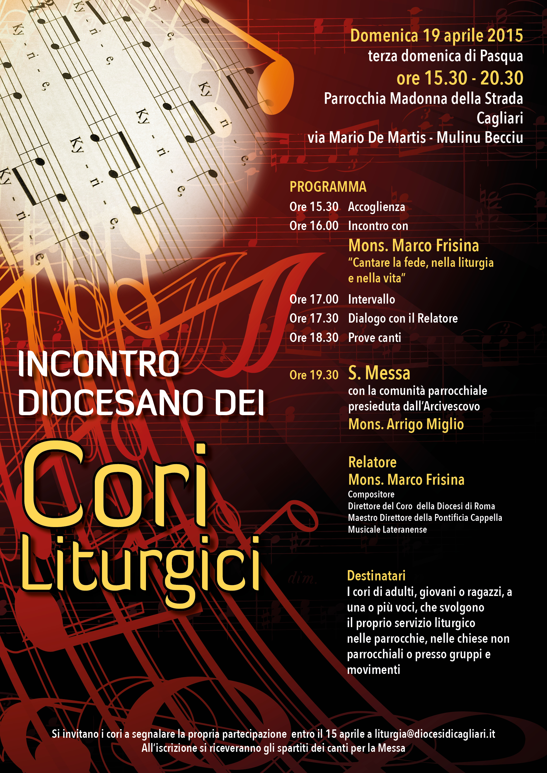 Si terrà domenica 19 aprile 2015, dalle 15.30 alle 20.30, presso la Parrocchia Madonna della Strada (Cagliari, via Mario De Martis – Mulinu Becciu) l’annuale incontro diocesano dei cori liturgici. Destinatari dell’incontro sono i cori di adulti, giovani o ragazzi, a una o più voci, che svolgono il proprio servizio liturgico nelle parrocchie, nelle chiese non parrocchiali o presso gruppi e movimenti