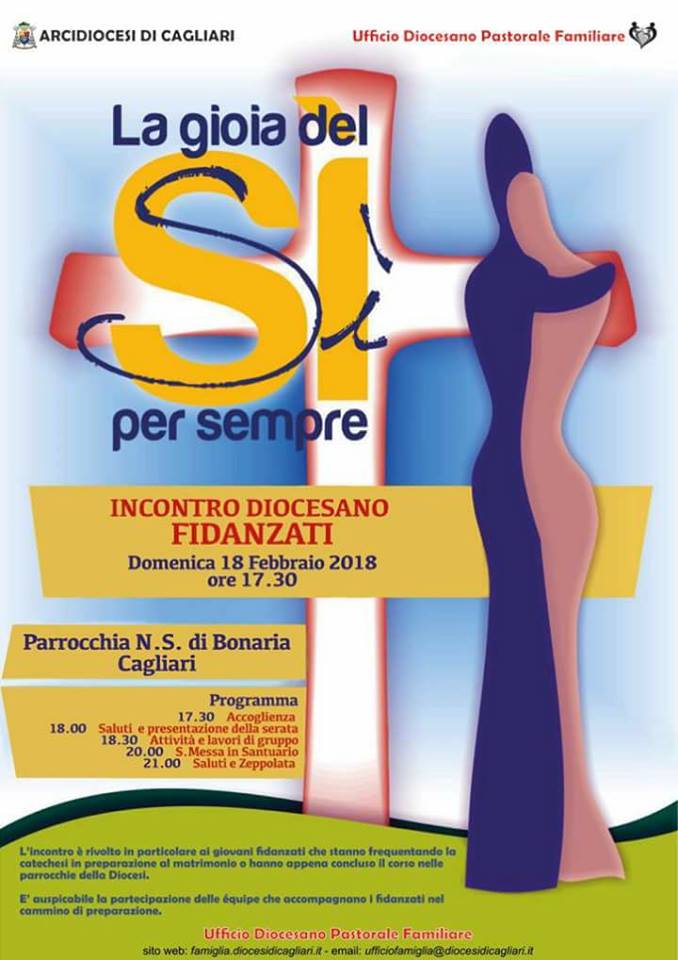 Si terrà domenica 18 febbraio 2018 l’annuale incontro diocesano dei fidanzati, destinato in particolare a coloro che stanno frequentando la catechesi in preparazione al matrimonio o hanno appena concluso il corso nelle parrocchie della diocesi.