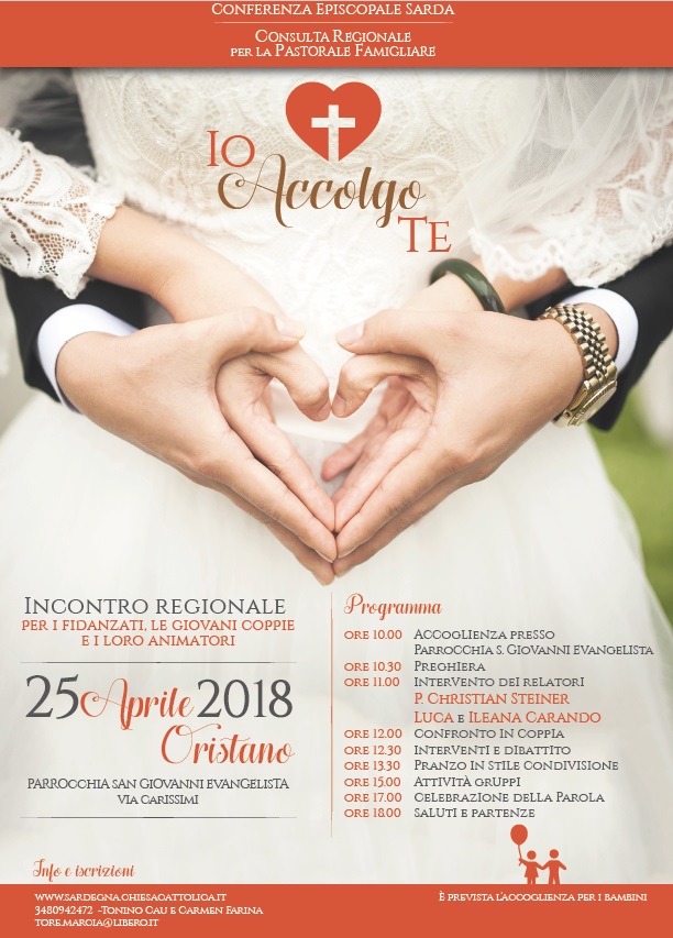 La consulta regionale per la pastorale della famiglia ha organizzato per il 25 aprile a Oristano, presso la parrocchia S. Giovanni Evangelista in via Carissimi, un incontro regionale per i fidanzati, le giovani coppie e le equipe che li accompagnano.