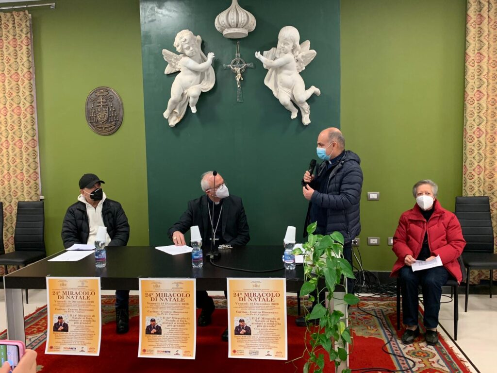 Svolta stamattina nel Seminario arcivescovile di Cagliari la conferenza stampa di presentazione della 24esima edizione di Miracolo di Natale, un’edizione ancora più significativa in piena pandemia -come ha sottolineato il direttore della Caritas diocesana don Marco Lai- in cui non sarà possibile il tradizionale svolgimento della manifestazione nella storica scalinata di N.S. di Bonaria ma che vedrà il prossimo 18 dicembre – data scelta per il Miracolo 2020– la consegna dei beni raccolti direttamente nel Centro Caritas di via Po, nel pieno rispetto delle normative anti-Covid.