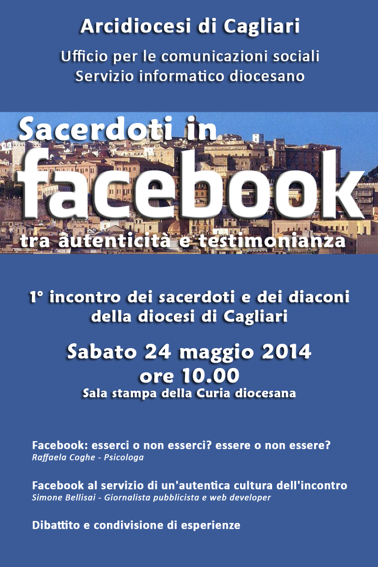 incontro sacerdoti diaconi facebook 15x15Sabato 24 maggio 2014 dalle ore 10.00 alle 12.30, presso la sala stampa della Curia diocesana (Cagliari, via mons. Cogoni, 9), si terrà il primo incontro dei sacerdoti e dei diaconi  della diocesi di Cagliari presenti su Facebook.
