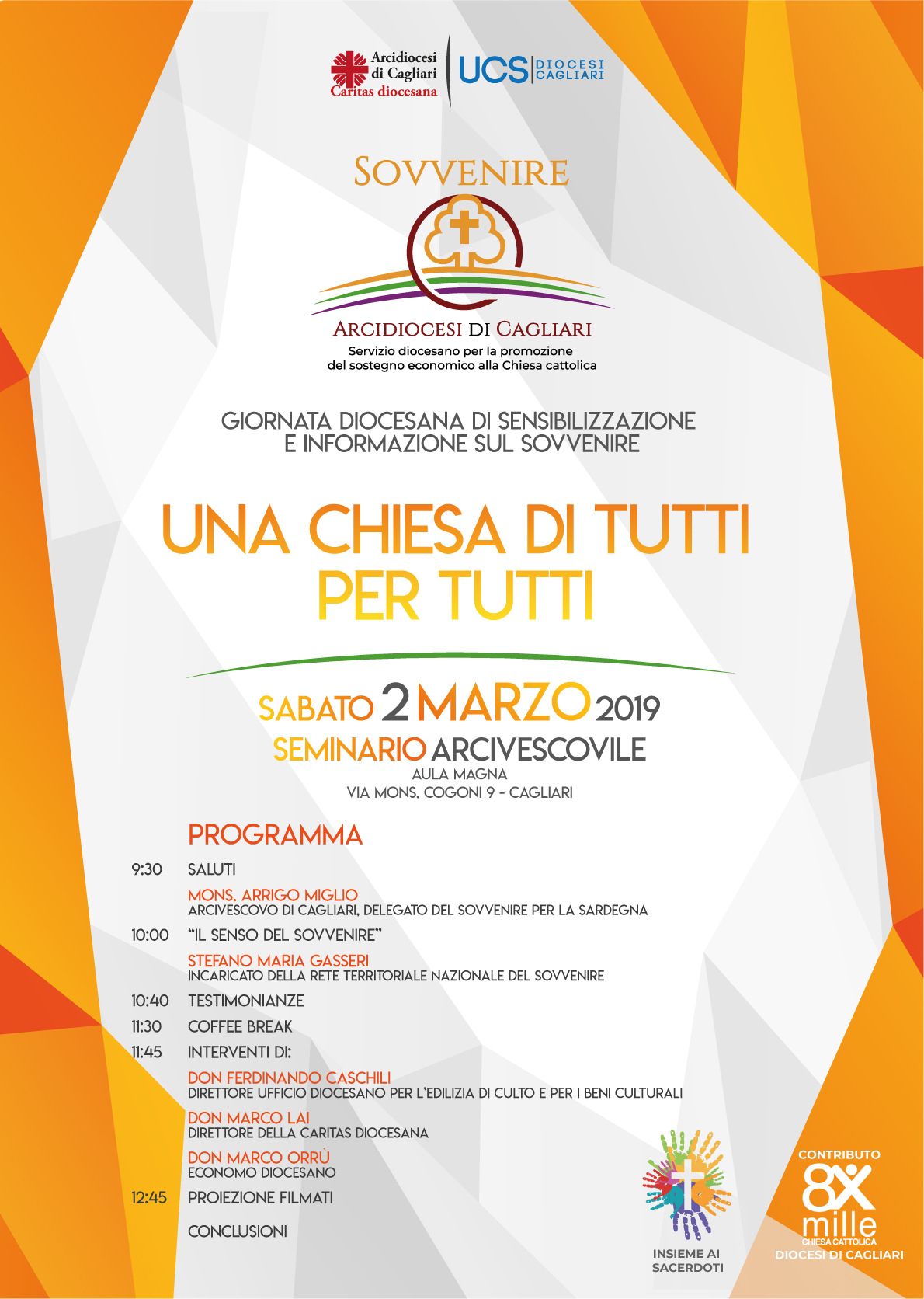 Sabato 2 marzo 2019 alle 9.30 nell’Aula Magna del Seminario arcivescovile di Cagliari si svolgerà la giornata diocesana di sensibilizzazione e informazione sul Sovvenire Una Chiesa di tutti per tutti, organizzata dall’Ufficio diocesano del Sovvenire (Servizio per la promozione del sostegno economico alla Chiesa cattolica) in collaborazione con la Caritas diocesana, e con gli uffici diocesani dell’economato, dell’edilizia di culto e beni culturali, e delle comunicazioni sociali.