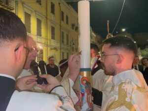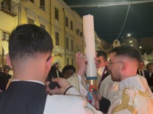 Il rito della luce ha aperto la celebrazione: dal fuoco nuovo è stato acceso il cero pasquale, segno di Cristo risorto, mentre la luce si diffondeva tra i fedeli. Il canto dell’Exsultet ha annunciato la Pasqua del Signore, proclamando la vittoria della vita sulla morte.