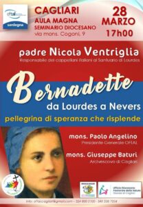 Venerdì 28 marzo alle 17, presso l’Aula Magna del Seminario arcivescovile di Cagliari (via monsignor G. Cogoni, 9), è previsto un incontro, promosso dall’Oftal Sardegna e dall’Ufficio diocesano per la Pastorale della Salute, dedicato alla figura di Santa Bernadette Soubirous, testimone della speranza e della fede, da Lourdes a Nevers.