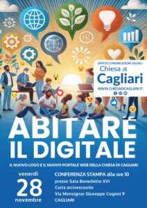 Venerdì 28 novembre alle ore 10.00, presso la Sala Benedetto XVI della Curia arcivescovile, è prevista la conferenza stampa di presentazione del nuovo logo e del nuovo portale web della Chiesa di Cagliari. L’iniziativa, dal titolo “Abitare il digitale”, rappresenta un momento significativo di rinnovamento e di slancio comunicativo per la diocesi, nel segno della comunione e della collaborazione tra le diverse realtà ecclesiali.