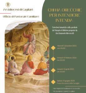 Venerdì 14 aprile alle 20, presso l’Aula Magna del Seminario arcivescovile di Cagliari (via monsignor G.Cogoni 9), è previsto il terzo incontro di catechesi, promosso dall’Ufficio diocesano di Pastorale familiare. L’appuntamento, dal titolo «Chi ha orecchie per intendere intenda», è tenuto dal direttore dell’Ufficio don Emanuele Meconcelli, che propone una riflessione sulle parabole del Vangelo di Matteo.