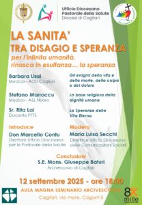Venerdì 12 settembre 2025 alle 18, presso l’Aula Magna del Seminario arcivescovile di Cagliari (via mons. Cogoni 9, Cagliari), si terrà il convegno «La sanità tra disagio e speranza. Per l’infinita umanità, rinasca in esultanza… la speranza», promosso dall’Ufficio diocesano per la Pastorale della Salute. L’incontro, introdotto da don Marcello Contu, direttore dell’Ufficio diocesano, sarà occasione per riflettere sui grandi interrogativi legati alla salute, alla dignità della persona e al senso cristiano del limite e della cura.