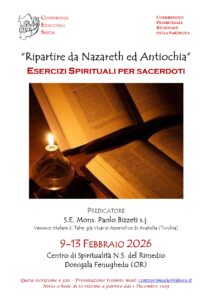 Dal 9 al 13 febbraio 2026 presso il Centro di spiritualità N.S. del Rimedio Donigala Fenugheddu (Via Oristano 8), la Conferenza Episcopale Sarda propone gli esercizi spirituali per i presbiteri, sul tema “Ripartire da Nazareth ed Antiochia”. Predicatore: S.E. Mons. Paolo Bizzeti S.I., vescovo titolare di Tabe. Iscrizioni a partire dal 1 dicembre 2025.