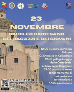 Domenica 23 novembre 2025 a partire dalle 10, presso la Cattedrale di Cagliari (piazza Palazzo 4/a), nella Solennità di Cristo Re e Giornata Mondiale della Gioventù nelle Chiese particolari, si celebrerà il Giubileo diocesano dei ragazzi e dei giovani, un momento di festa e di fede per tutti i ragazzi dai 14 anni in su, che vivranno insieme al vescovo un’esperienza di preghiera, cammino e incontro. Dopo il raduno in piazza Palazzo, alle 10.30 è prevista la santa messa , a seguire il pellegrinaggio verso il Seminario regionale, dove le attività si concluderanno nel pomeriggio.