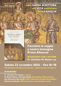 Sabato 23 novembre dalle 16, presso la sala Benedetto XVI della Curia (via monsignor G. Cogoni 9, Cagliari), l’associazione Oltre la Porta, in collaborazione con l’Ufficio per le comunicazioni sociali e la Pastorale familiare della Diocesi di Cagliari, propone l’evento «Dalla Sacra Scrittura alla vita quotidiana delle famiglie», durante il quale sarà presentato il libro «Facciamo la coppia a nostra immagine. Prima Alleanza», scritto da fr. Christian M. Steiner.