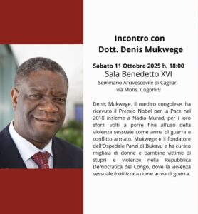 Sabato 11 ottobre alle 18 presso la sala Benedetto XVI della Curia arcivescovile di Cagliari (via monsignor Giuseppe Cogoni, 9), è previsto un incontro con il premio Nobel per la pace Denis Mukwege. L’evento precede la Veglia diocesana di preghiera prevista nella Basilica di Nostra Signora di Bonaria alle 20.15.