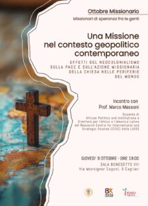 Giovedì 9 ottobre alle ore 19:00, presso la Sala Benedetto XVI in via Monsignor Cogoni 9 a Cagliari, si terrà l’incontro dal titolo “Una Missione nel contesto geopolitico contemporaneo”. La conferenza, promossa dall’Ufficio missionario diocesano nell’ambito dell’ottobre missionario, è incentrata sugli effetti del neocolonialismo sulla pace e sull’azione missionaria della Chiesa nelle periferie del mondo, sarà guidata dal professor Marco Massoni, docente di African Politics and Institutions e direttore per l’Africa e l’America Latina del Research Centre for International and Strategic Studies (CISS) della LUISS.