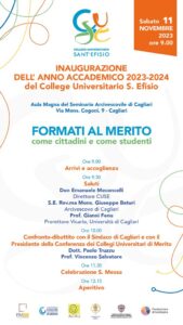 Sabato 11 novembre alle 9, presso l’Aula Magna del Seminario arcivescovile di Cagliari, è prevista l’inaugurazione del nuovo Anno accademico del College universitario Sant’Efisio, alla quale partecipano tra gli altri l’arcivescovo di Cagliari e segretario generale della Cei monsignor Giuseppe Baturi, e il direttore del Collegio don Emanuele Meconcelli.
