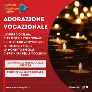 Domenica 20 Febbraio 2022 alle ore 19.30, presso la parrocchia di Santa Barbara a Sinnai (Piazza Santa Barbara, 9), l’èquipe diocesana di Pastorale vocazionale e il seminario arcivescovile promuovono un incontro di adorazione eucaristica. Un’occasione per ricordare la figura di don Alberto Pistolesi, parroco di questa comunità recentemente scomparso, e per chiedere al Signore il dono di veder sbocciare numerose vocazioni al servizio del Regno di Dio.