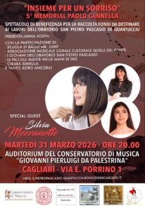 Martedì 31 marzo, alle ore 20, presso l’Conservatorio di Musica Giovanni Pierluigi da Palestrina di Cagliari, si terrà lo spettacolo di beneficenza “Insieme per un sorriso”, quinto Memorial Paolo Cannella.