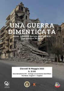 Giovedì 18 maggio alle 21, presso la sala Benedetto XVI della Curia arcivescovile di Cagliari (via monsignor G. Cogoni, 9), l’Ufficio diocesano per la Pastorale universitaria e della Cultura, in collaborazione con il College universitario Sant’Efisio, promuove un incontro con il vescovo monsignor Giuseppe Baturi, che racconterà il suo viaggio in Siria, in qualità di Segretario generale della Cei.