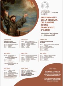 Dal 23 al 30 marzo, presso la parrocchia cittadina dei Santi Giorgio e Caterina (via Scano) è prevista l’accoglienza della reliquia del sangue di san Francesco d’Assisi. Alle 16.30 si inizia con l’adorazione eucaristica e si prosegue con un fitto programma (in allegato) per l’intera settimana. Martedì 25 la celebrazione eucaristica sarà presieduta dall’Arcivescovo.