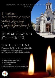 La Parrocchia di San Giovanni Battista in Pula (vicolo Chiesa 16) propone tre serate di catechesi in preparazione al Natale, guidate da mons. Roberto Piredda, direttore dell’Ufficio diocesano per l’insegnamento della religione cattolica.