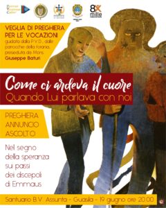 Giovedì 19 giugno alle 20, presso il Santuario della Beata Vergine Assunta di Guasila (via Teologo Melas,2), è prevista una veglia di preghiera guidata dalla Pastorale vocazionale della forania di Senorbì e presieduta dall’Arcivescovo, sul tema “Come ci ardeva il cuore. Quando lui parlava con noi”.