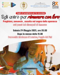 Sabato 24 maggio alle 20, presso la parrocchia Madonna di Lourdes di Poggio dei Pini (Via S. Bernadette Soubirou, 3), è prevista una veglia di preghiera per le vocazioni promossa dalla Pastorale vocazionale, sul tema “Egli entrò per rimanere con loro. Preghiera, annuncio, ascolto nel segno della speranza sui passi dei discepoli di Emmaus”.