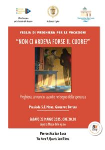 Sabato 22 marzo 2025 alle 20.30, presso la parrocchia San Luca (via Nora 9, Quartu Sant’Elena), è prevista una veglia di preghiera per le vocazioni organizzata dalla Diocesi di Cagliari e dall’Ufficio per la Pastorale delle vocazioni, in collaborazione con la parrocchia San Luca. Il tema della veglia, presieduta dal vescovo Giuseppe Baturi,  è “Non ci ardeva forse il cuore?”. L’evento si concentrerà su momenti di preghiera, annuncio e ascolto come segni di speranza.