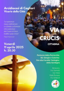 Venerdì 11 aprile alle ore 20.30, dalla parrocchia dei Santi Giorgio e Caterina di Cagliari (via Francesco Gemelli, 2), partirà la via Crucis cittadina, presieduta dal vescovo monsignor Giuseppe Baturi, che culminerà presso il piazzale d’ingresso della Facoltà teologica.