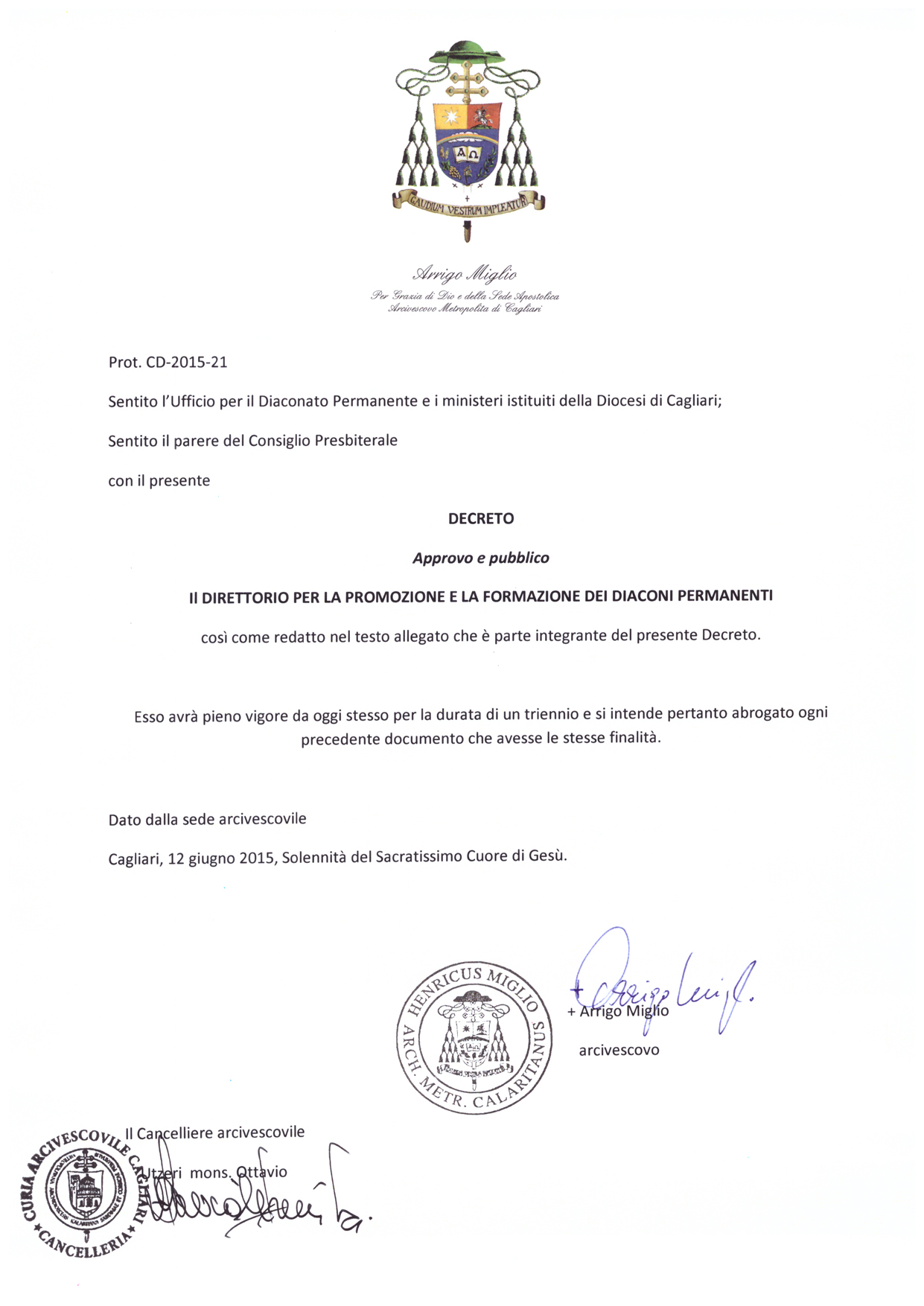 In data 12 giugno 2015, l’arcivescovo di Cagliari, Arrigo Miglio, ha pubblicato il decreto di approvazione del “Nuovo direttorio per la promozione e la formazione dei diaconi permanenti” per la diocesi di Cagliari. Il direttorio entra in pieno vigore dalla data di pubblicazione per la durata di un triennio, e si intende pertanto abrogato ogni precedente documento che avesse le stesse finalità.